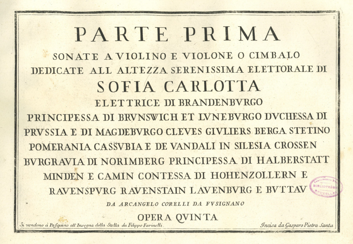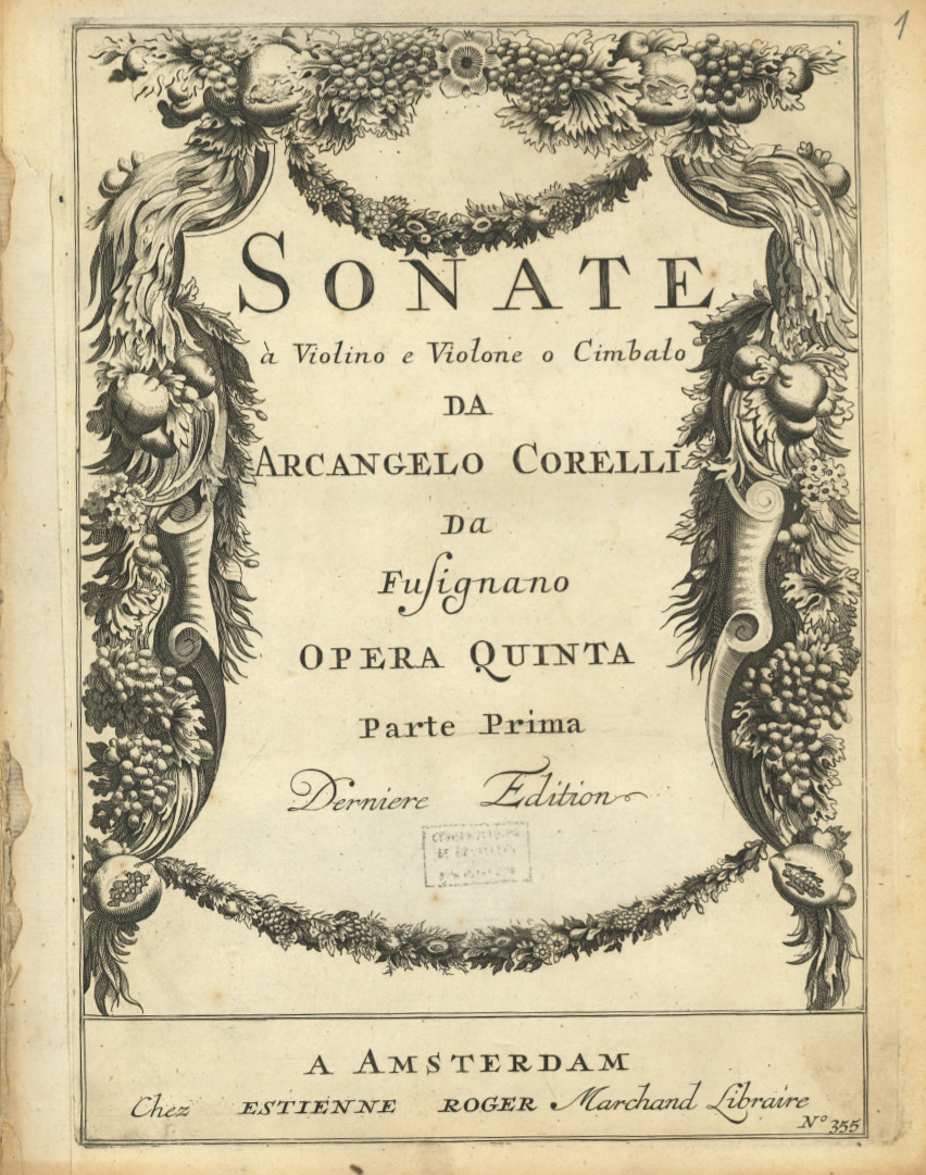 The well-known opus 5 of Arcangelo Corelli with Sonatas for violin and basso continuo, published by Roger in Amsterdam. This edition has no longer a frontispiece, but the title page itself is decorated. B-Bc 5663.