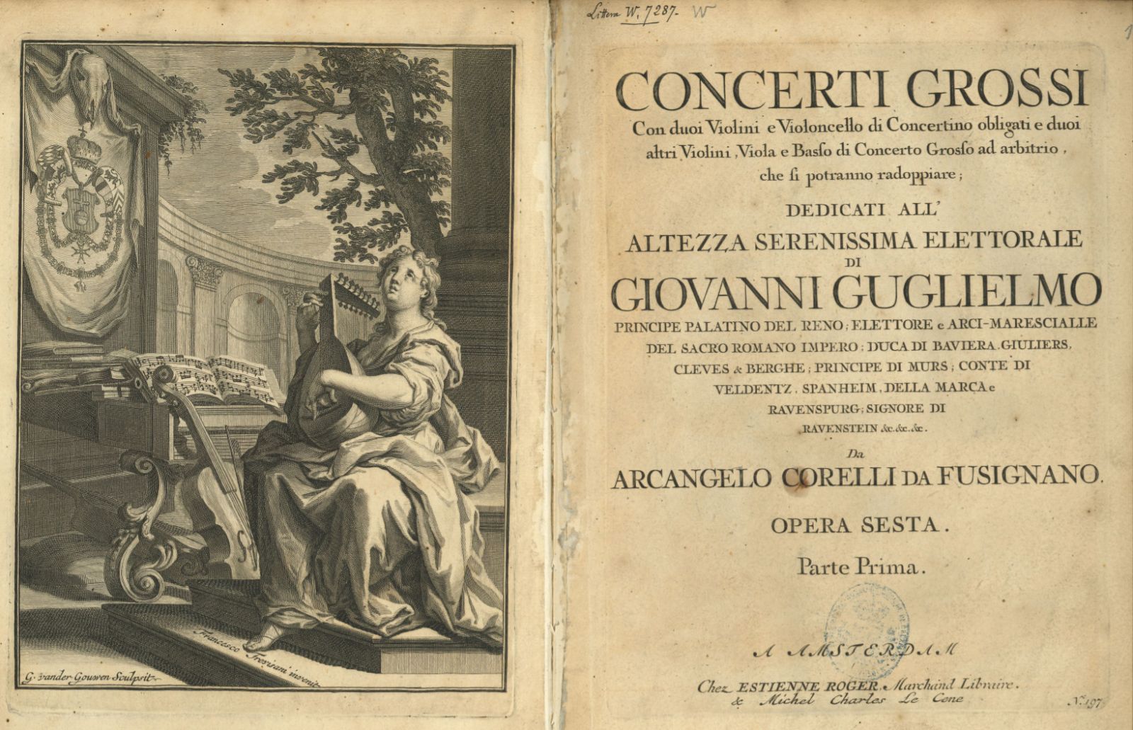 Concerti grossi, opus 6 by Arcangelo Corelli (1653-1713), published by Roger and Le Cene in Amsterdam, ca. 1719. The frontispiece is only printed in the first violin part. B-Bc 7287.