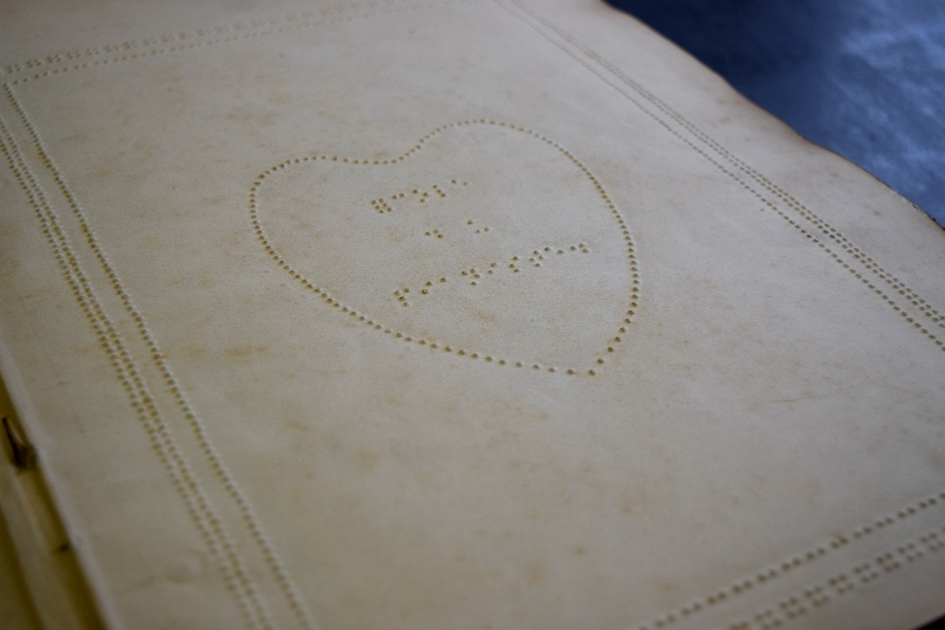Een reeks oude ingebonden braillepartituren.