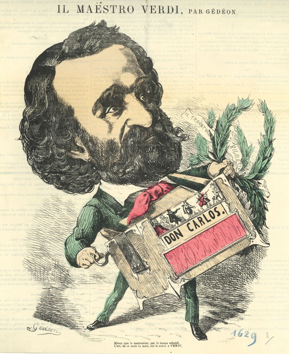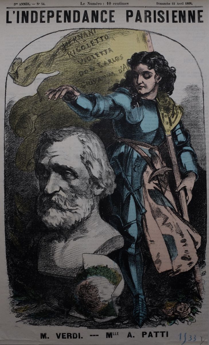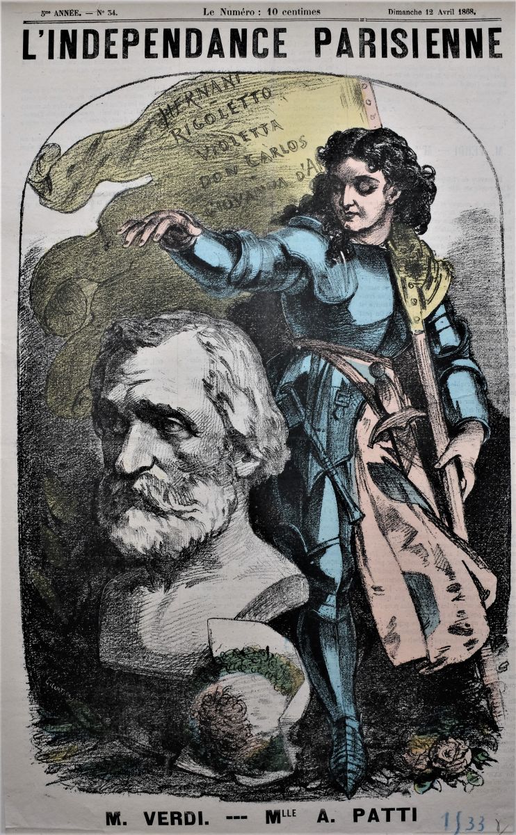 Na de geflopte première van de opera Giovanna d'Arco in 1845 in de Scala van Milaan, nam Adeline Patti in 1868 de rol van Jeanne d’Arc op zich voor de Parijse uitvoeringen in het Théâtre des Italiens. Naar aanleiding van de Parijse première publiceerde de krant "L'Indépendance parisienne" op 12 april 1868 deze tekening van Verdi en de sopraan Patti, gekleed als Jeanne d'Arc. Daarnaast een karikatuur van Verdi met draaiorgel, gepubliceerd in Le Hanneton in 1867.