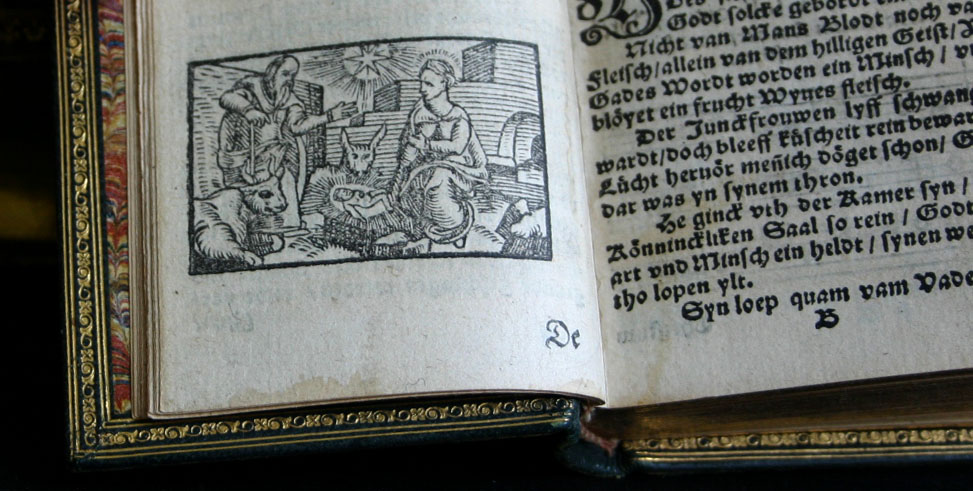De liedbundel bevat weinig illustraties. Dit eerder ruw gegraveerde kersttafereel uit de 17e eeuw staat in sterk contrast met de dure boekband uit de 19e eeuw.