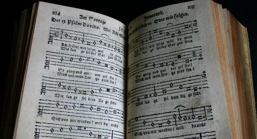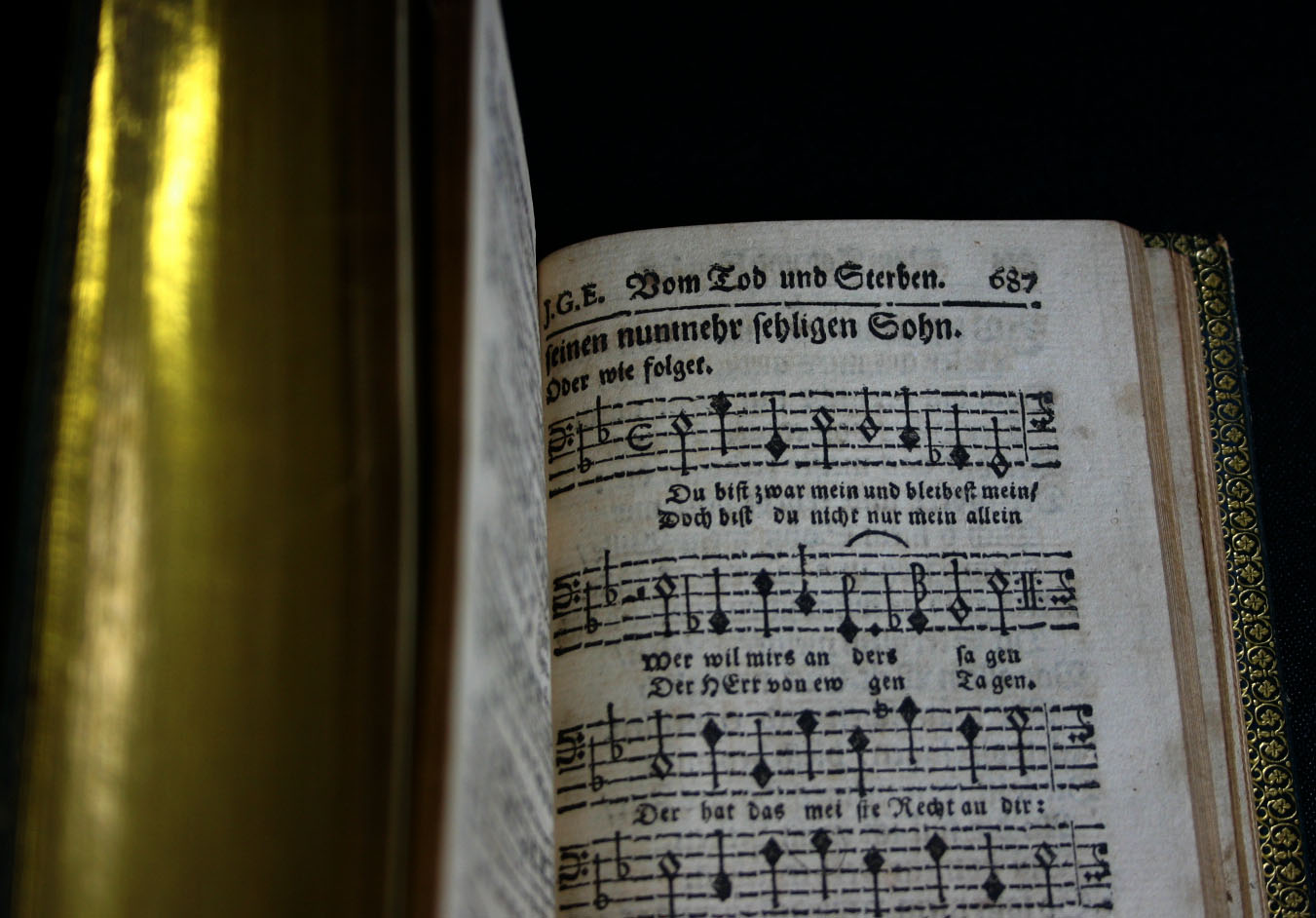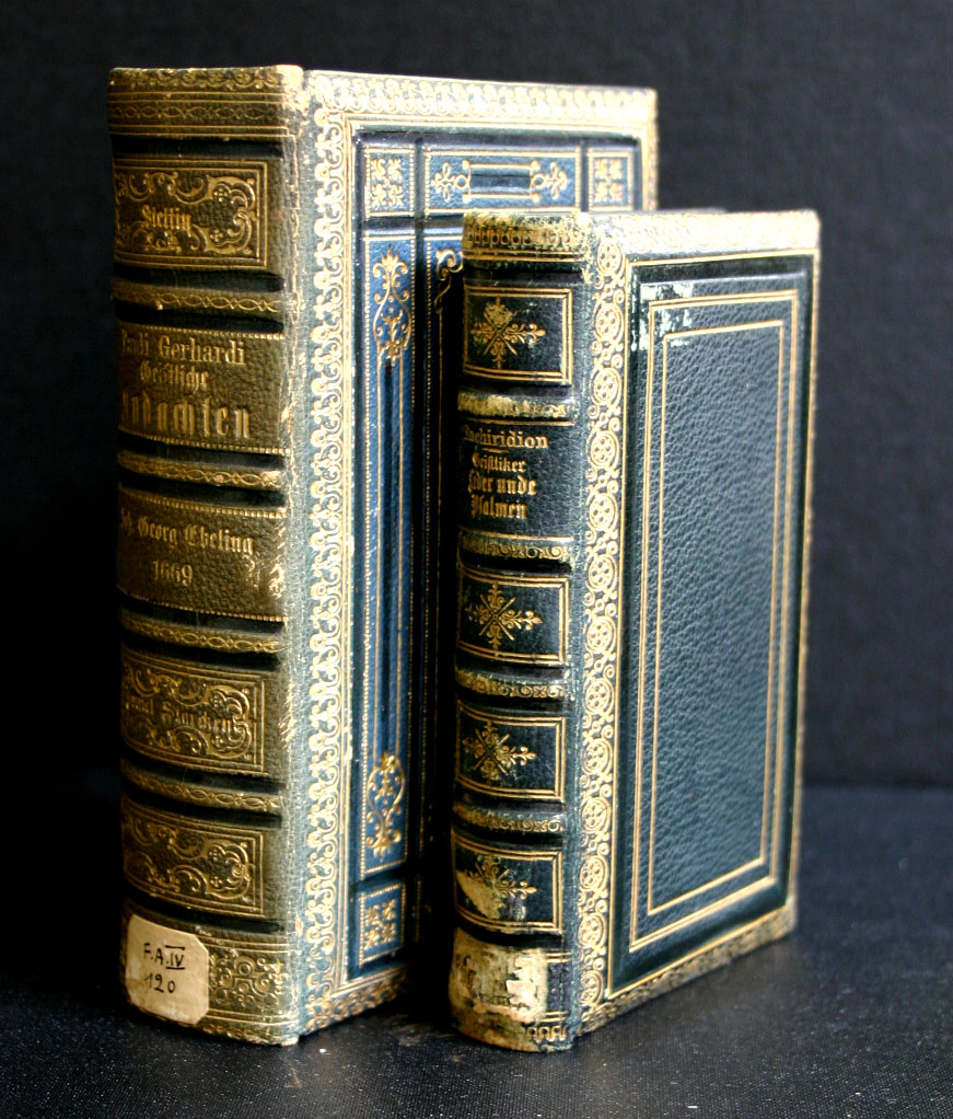 Geistliche Andachten van Paul Gerhard, 1662, en de Enchiridion Giestlicher Leder unde Psalmen van Martin Luther, 1570 in rijkelijk versierde banden uit de late 19e eeuw. Vooral de afgeschuinde platten met goudstempeling getuigen van verfijnde luxe.