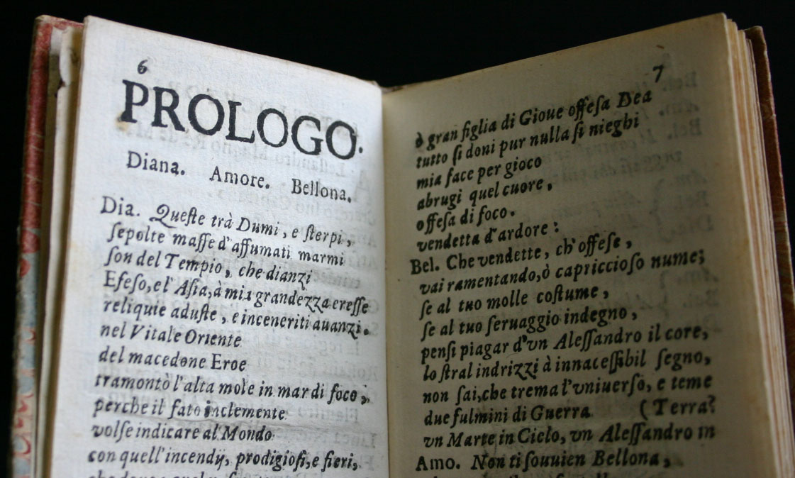 La Passione di Gesu’ Cristo van Confidati, uit 1813, L’eroina d’Allesandria van Berti uit 1714 en La Rosane van Cicognini uit 1663. Drie Italiaanse libretti uit drie verschillende eeuwen, in drie verschillende formaten – van 13 tot 15,5 cm –, maar elk met een decoratieve papieren band. Spijtig genoeg aan de voorzijde verknoeid met een opzichtig en wel erg groot etiket, aangebracht op de in de vroege 20e eeuw.