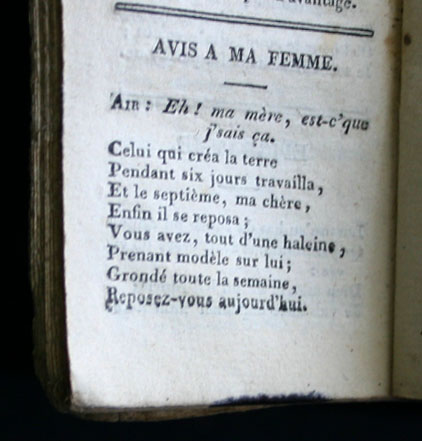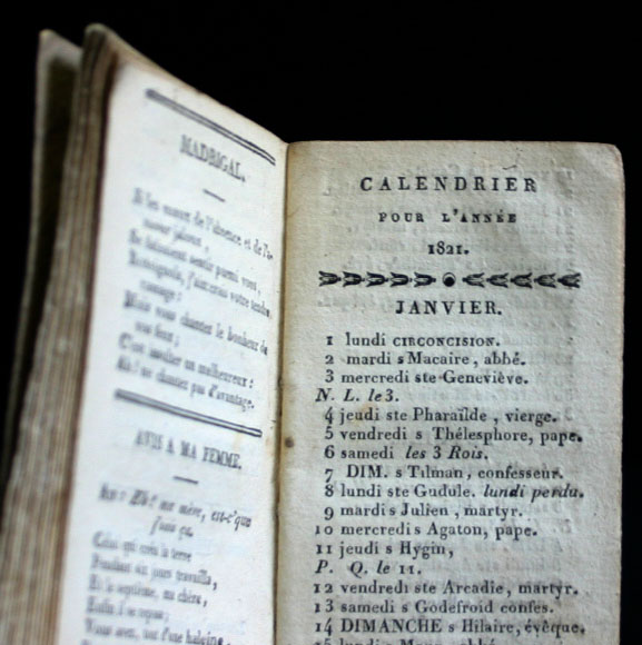 Het kleine boekje, amper 10 cm hoog, bevat enkel tekst, maar in een aantal gevallen, zoals het gedicht ‘Avis à ma femme’, wordt de melodie vermeld waarop de tekst gezongen kan worden. Deze almanak uit 1821 doet duidelijk al aan klantenbinding. De ‘cliffhanger’ waarmee dit spannende verhaal eindigt, krijgt pas zijn vervolg in de volgende aflevering, nl. de almanak van 1822.