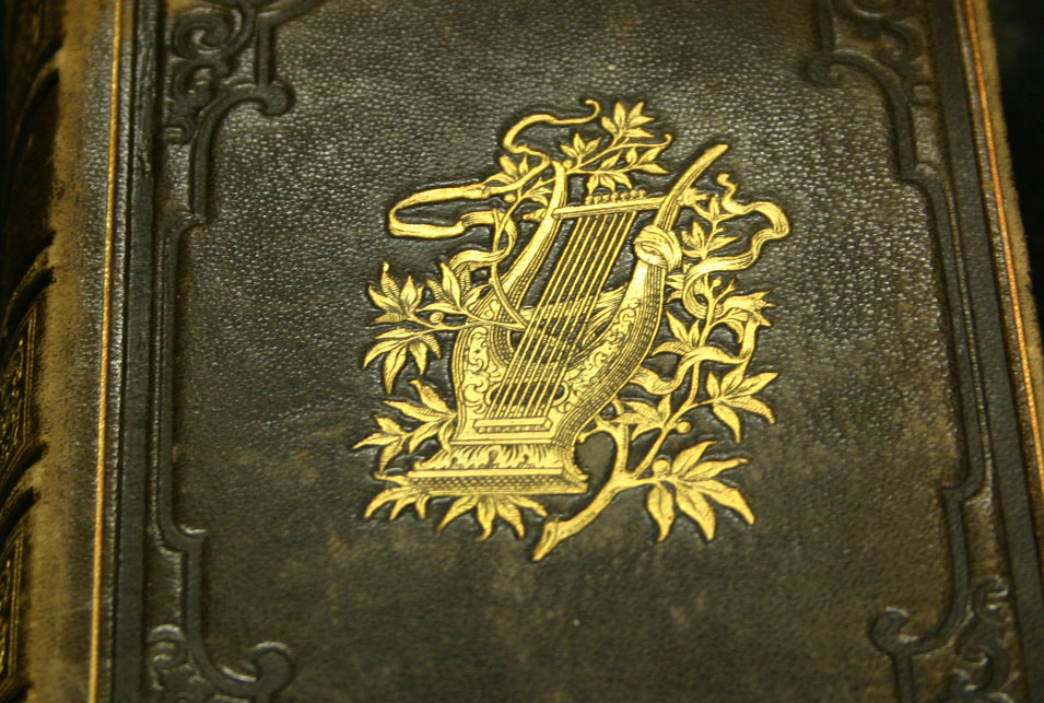 De Davids Psalmen, nach französischen Melodien in Deutsche Reime gebracht durch Ambrosium Lobwasser, Berlin, 1700, is ingebonden in een elegante boekband. Geen religieuze symbolen, maar een barokke band met lier op het voorplat en musicerende engelen op het achterplat.
