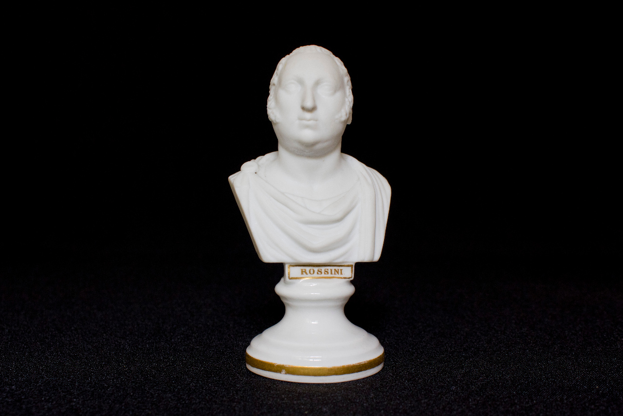 De collectie bevat ook een tiental voorwerpen. Het opvallendste hiervan is een waaiervormige vaas in porselein, ca. 1850, die een staalkaart geeft van Rossini’s bekendste werken. De witte zwaan voor het portret in terracotta van Rossini is een overduidelijke verwijzing naar zijn bijnaam ‘de zwaan van Pesaro’. Er zijn ook nog een paar gebruiksvoorwerpen van Rossini zoals zijn briefopener en zijn pince-nez.